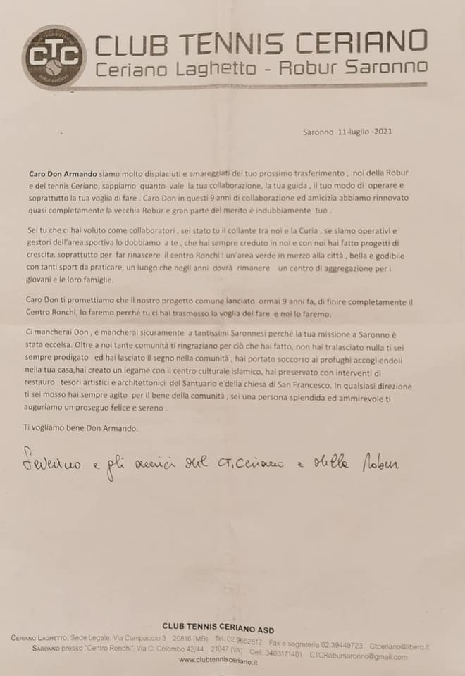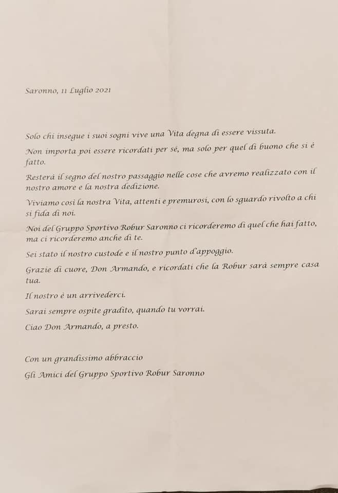 Le parole del presidente del CTC Ceriano Robur, Severino Rocco, e del responsabile organizzativo del Gruppo Sportivo Robur Saronno, Giorgio Nocera, hanno espresso tutto l’affetto e l’attaccamento al caro Don Armando. A Saronno resterà di lui il ricordo delle molte cose fatte e la sua vicinanza alla realtà quotidiana delle cose.