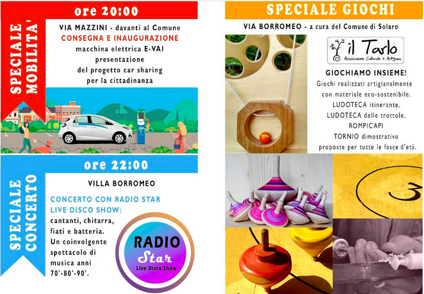 Per quanto riguarda gli eventi organizzati direttamente dal Comune, si comincia alle 20 con la consegna ed inaugurazione della nuova auto elettrica del servizio di car sharing E-Vai. Alle 22 è in programma il concerto con i Radio Star Disco Show, un coinvolgente spettacolo di musica anni ’70, ’80, ’90, sul palco allestito davanti alla Villa Borromeo. Per tutta la serata, in via Borromeo tutti invitati alla ludoteca a cielo aperto organizzata in collaborazione con l’associazione culturale e artigiana Il Tarlo, con la possibilità di provare giochi realizzati artigianalmente con materiale ecosostenibile.