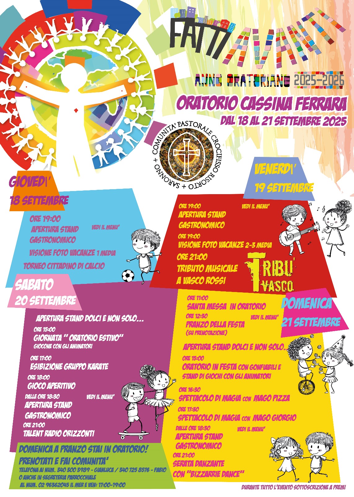 Prende il via domani, giovedì 18 settembre, la Festa dell’Oratorio di Cassina Ferrara a Saronno, che proseguirà fino a domenica 21 settembre.